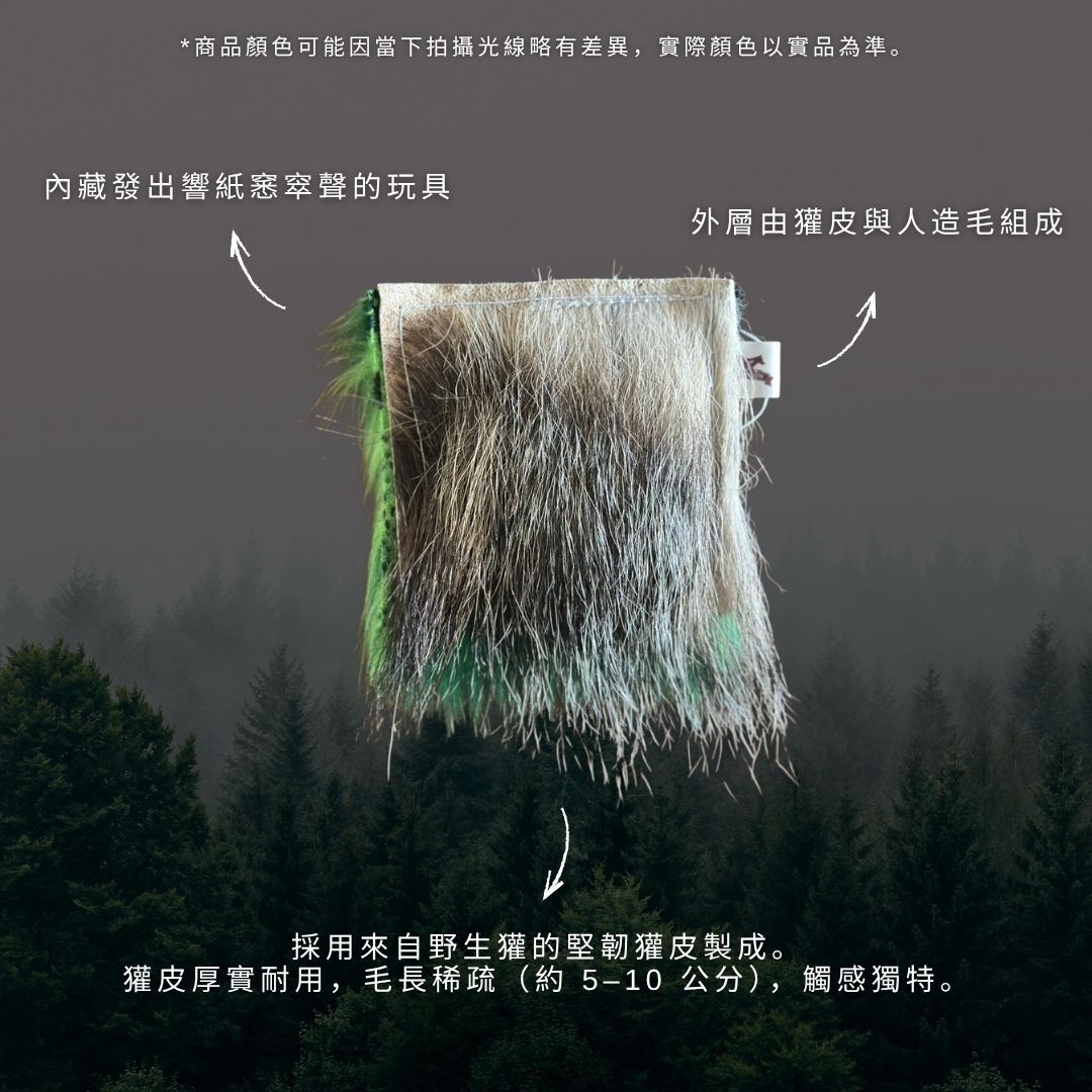 此玩具由雙層結構組成,外層為獾皮毛與人造毛,內層則藏有響紙窸窣聲