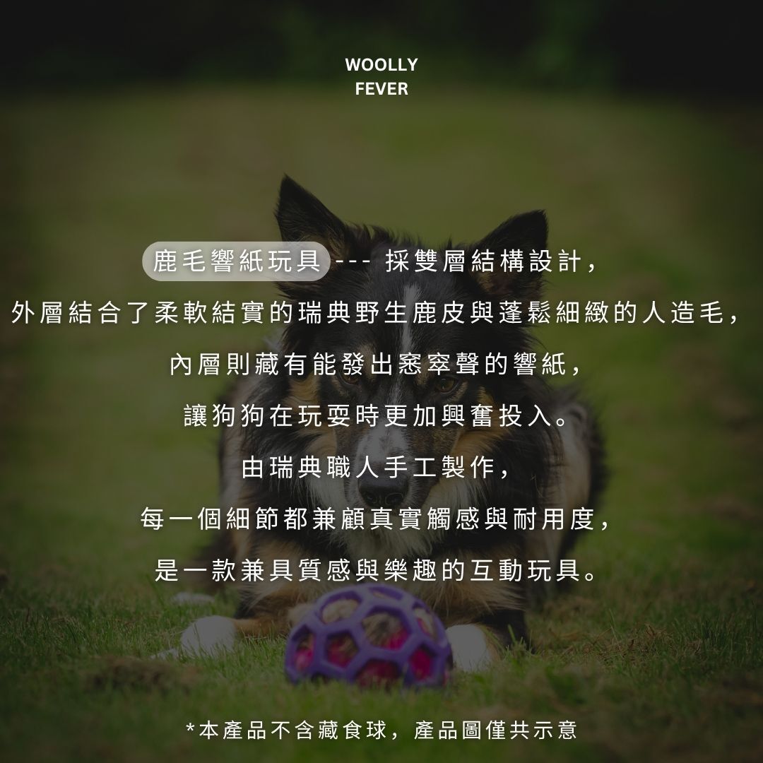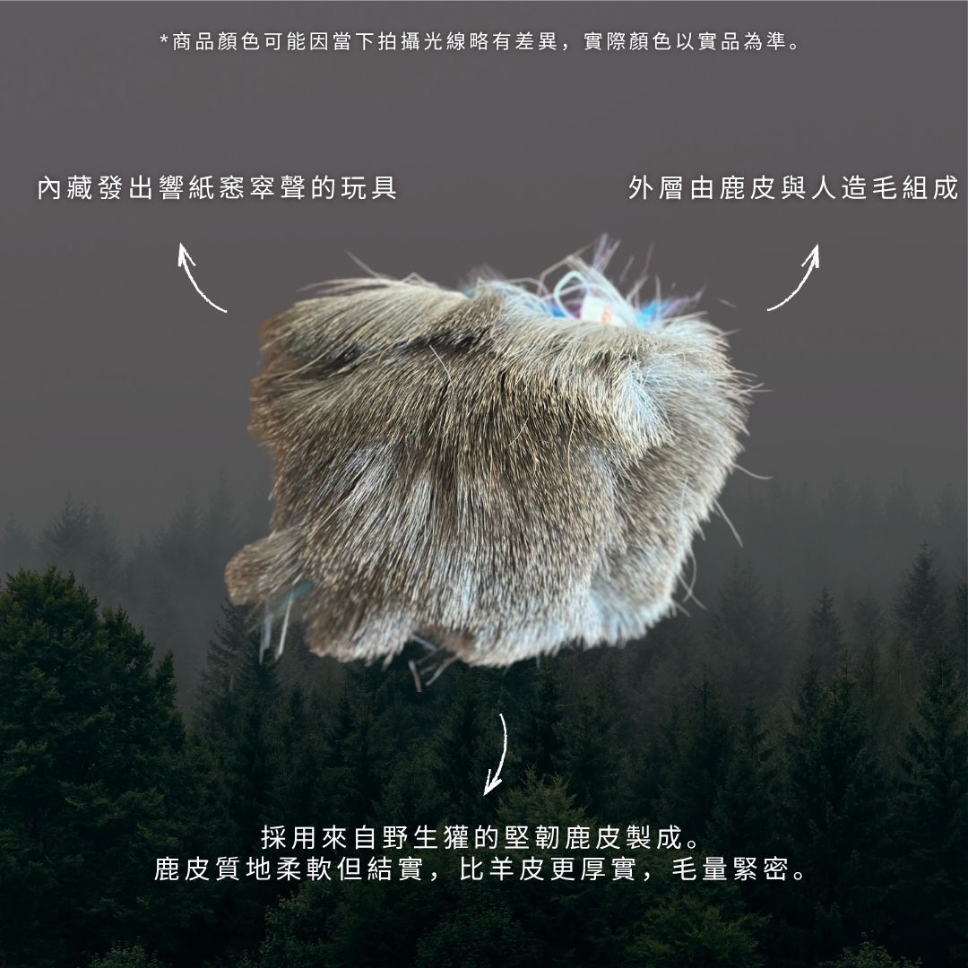 此玩具由雙層結構組成,外層為鹿皮毛與人造毛,內層則藏有響紙窸窣聲