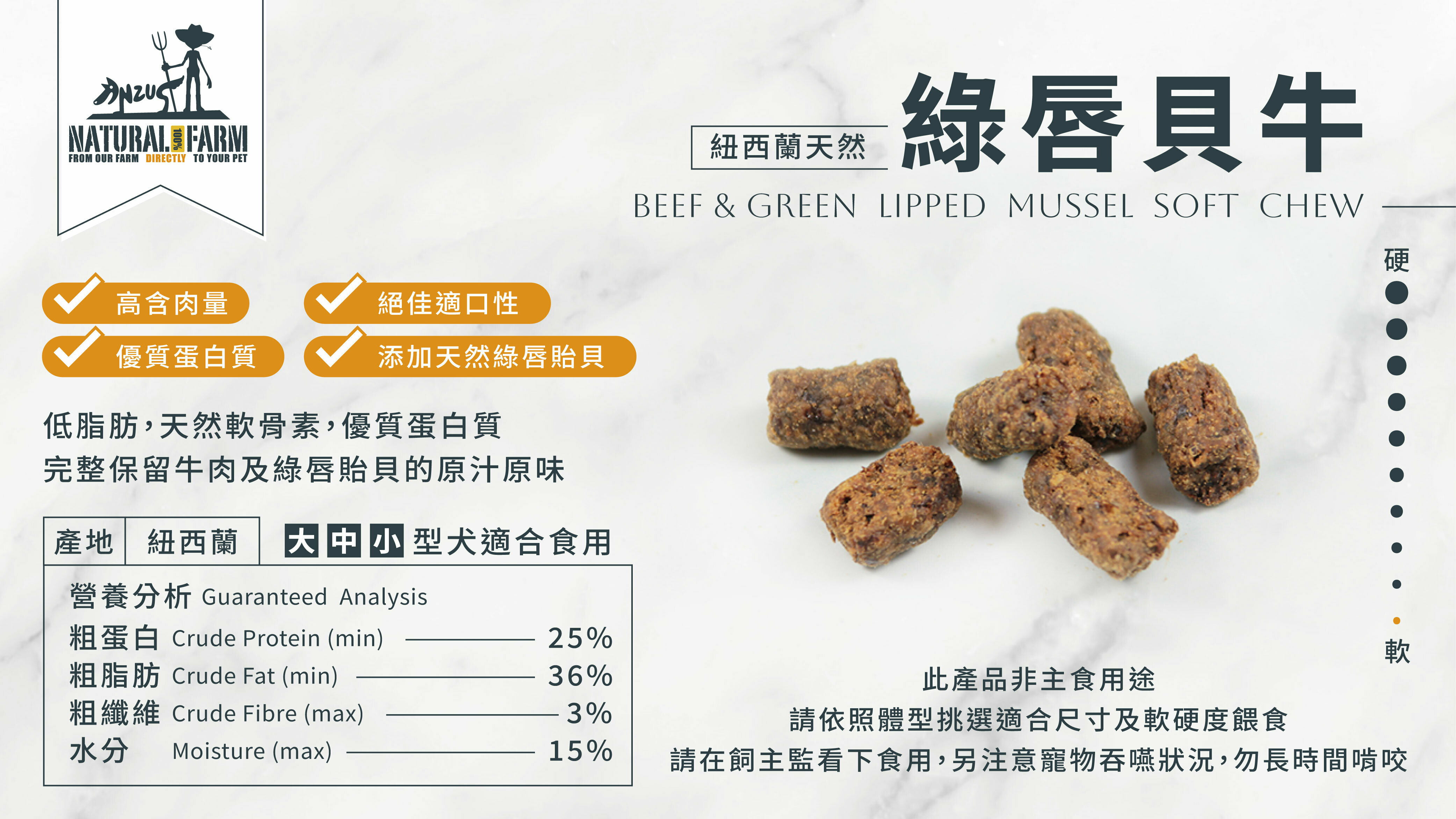 ⟢採用100%紐西蘭天然牛肉、牛肝、綠唇貽貝、亞麻籽、植物甘油、豌豆蛋白