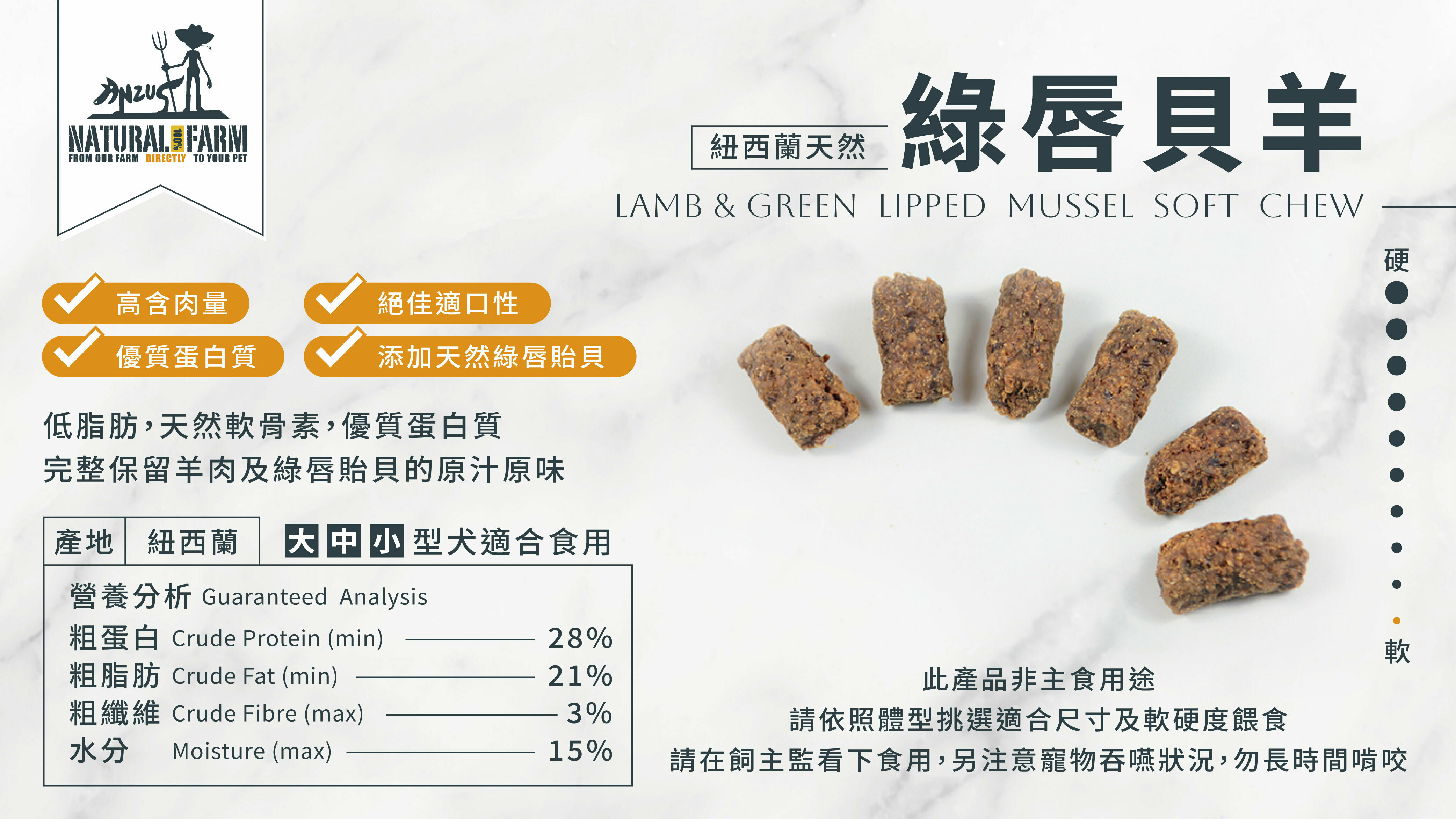 ⟢採用100%紐西蘭天然羊肉、羊肝、綠唇貽貝、亞麻籽、植物甘油、豌豆蛋白