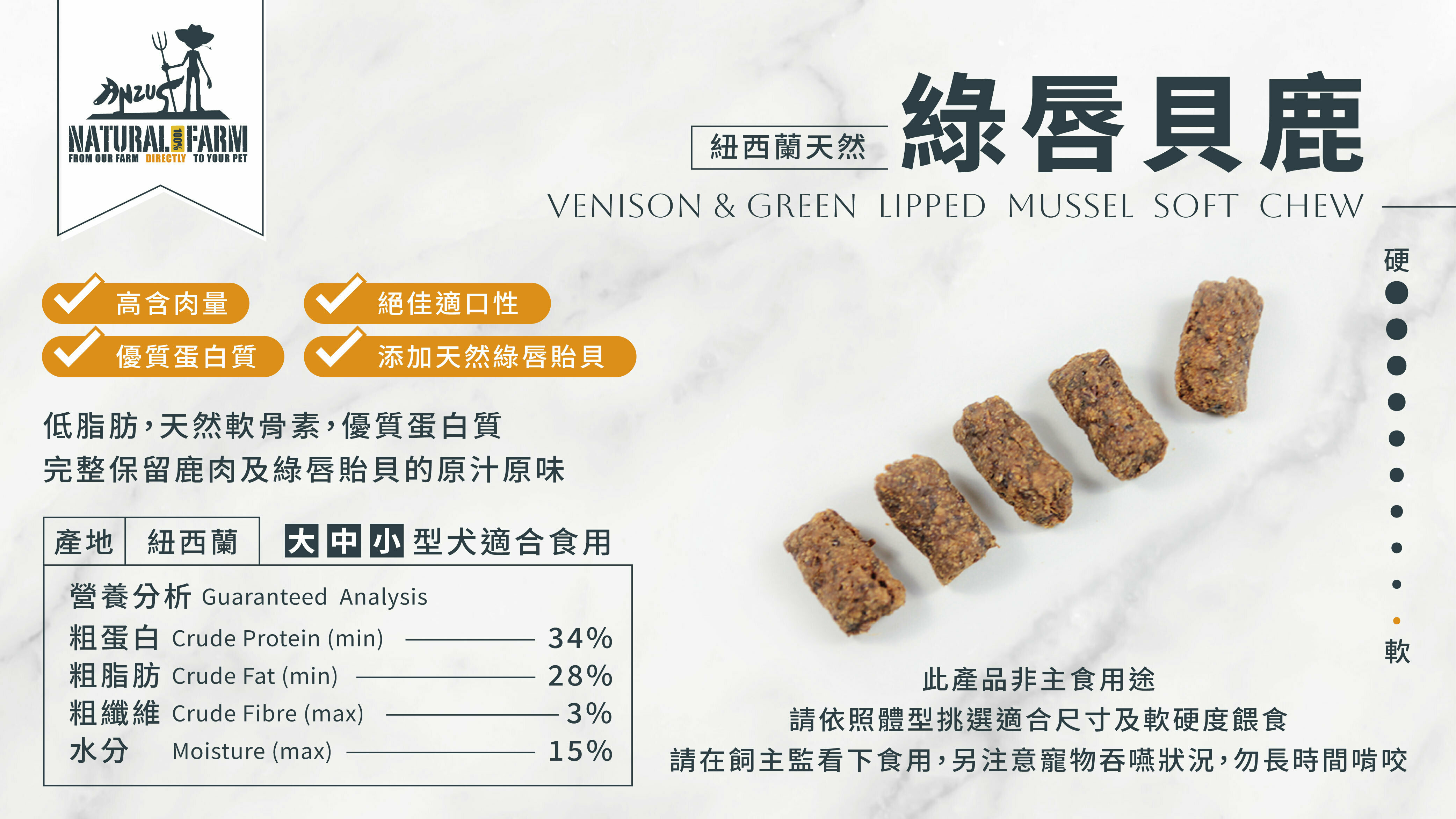 ⟢採用100%紐西蘭天然鹿肉、鹿肝、綠唇貽貝、亞麻籽、植物甘油、豌豆蛋白
